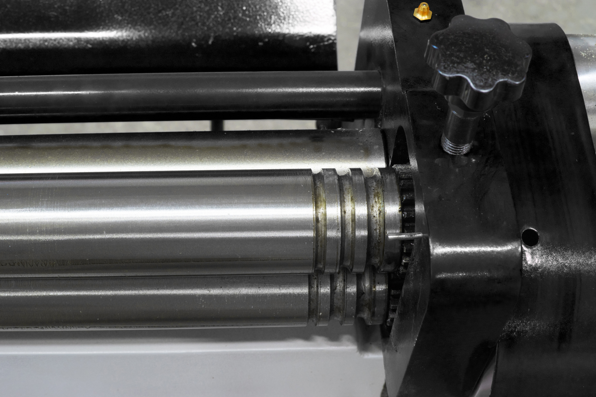 Вальцы с диаметром 60 мм. Вальцы имеют трёхваловую конструкцию, верхний вал консольно отводится в сторону для съёма обечайки.