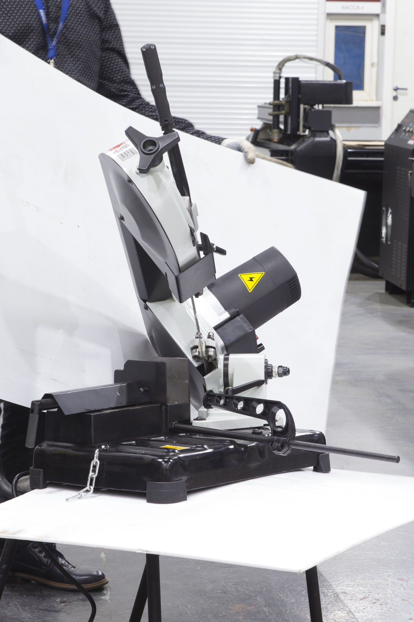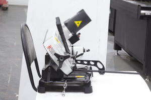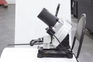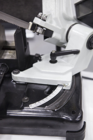 Данная модель оснащена стационарными тисками, для резки под углом, поворачивается рама, а не заготовка. Зажим заготовки осуществляется тисками вручную, за счет вращения маховика, подача заготовки - также вручную.