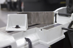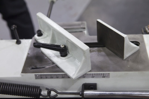 Пильную раму возможно установить в вертикальном положении - для резки небольших изделий из дерева, пластмассы и других заготовок из мягких материалов (для которых не требуется фиксация в тисках во время пиления) при этом станок обязательно должен крепиться к полу. В стандартной комплектации имеется небольшой стол для ручной подачи заготовок, который крепится к раме в вертикальном положении. |