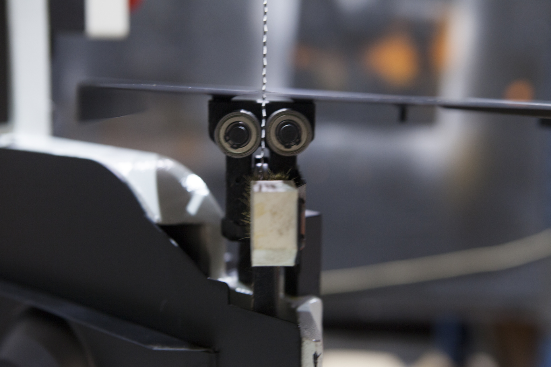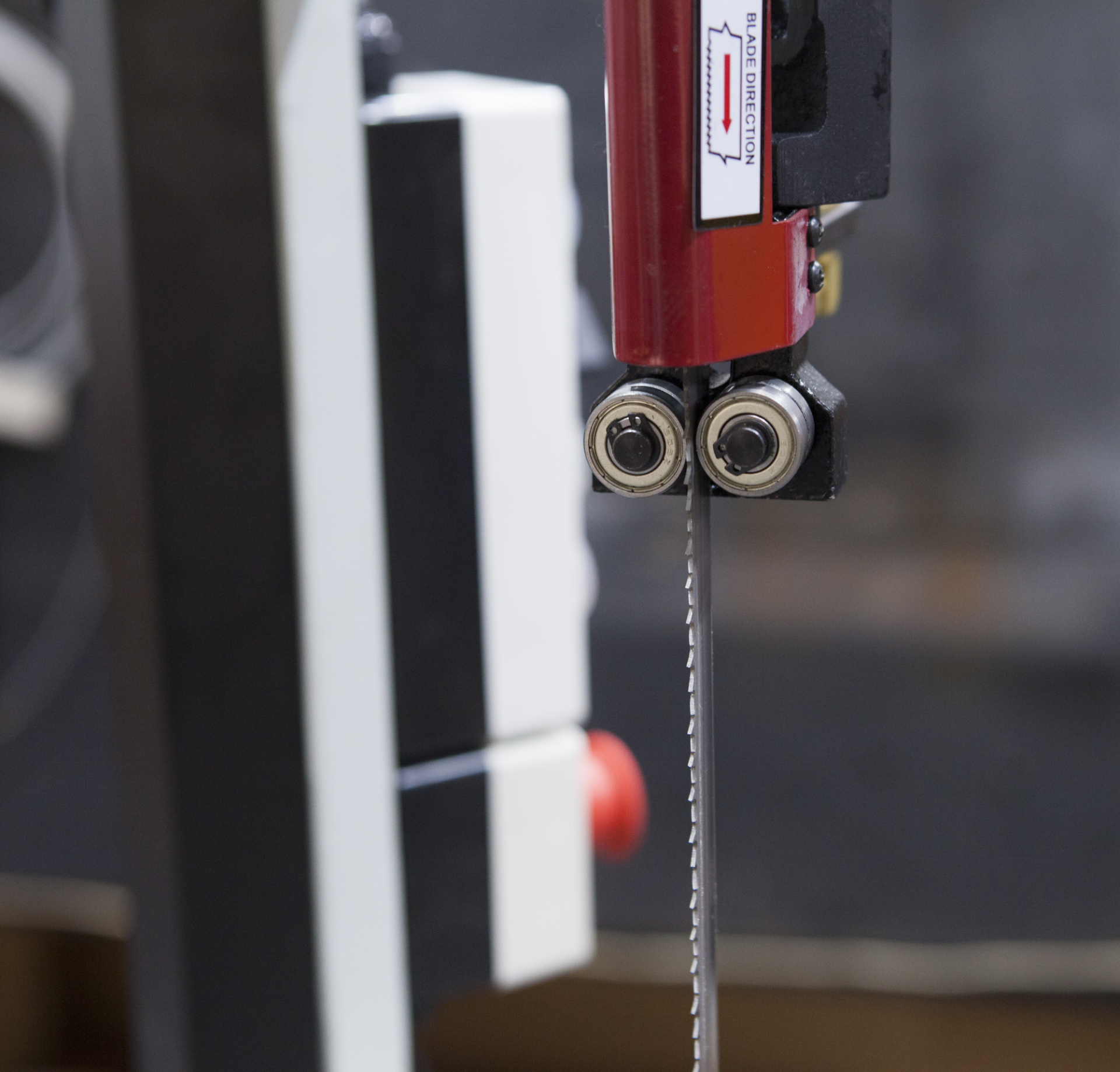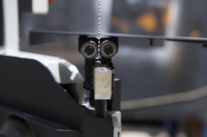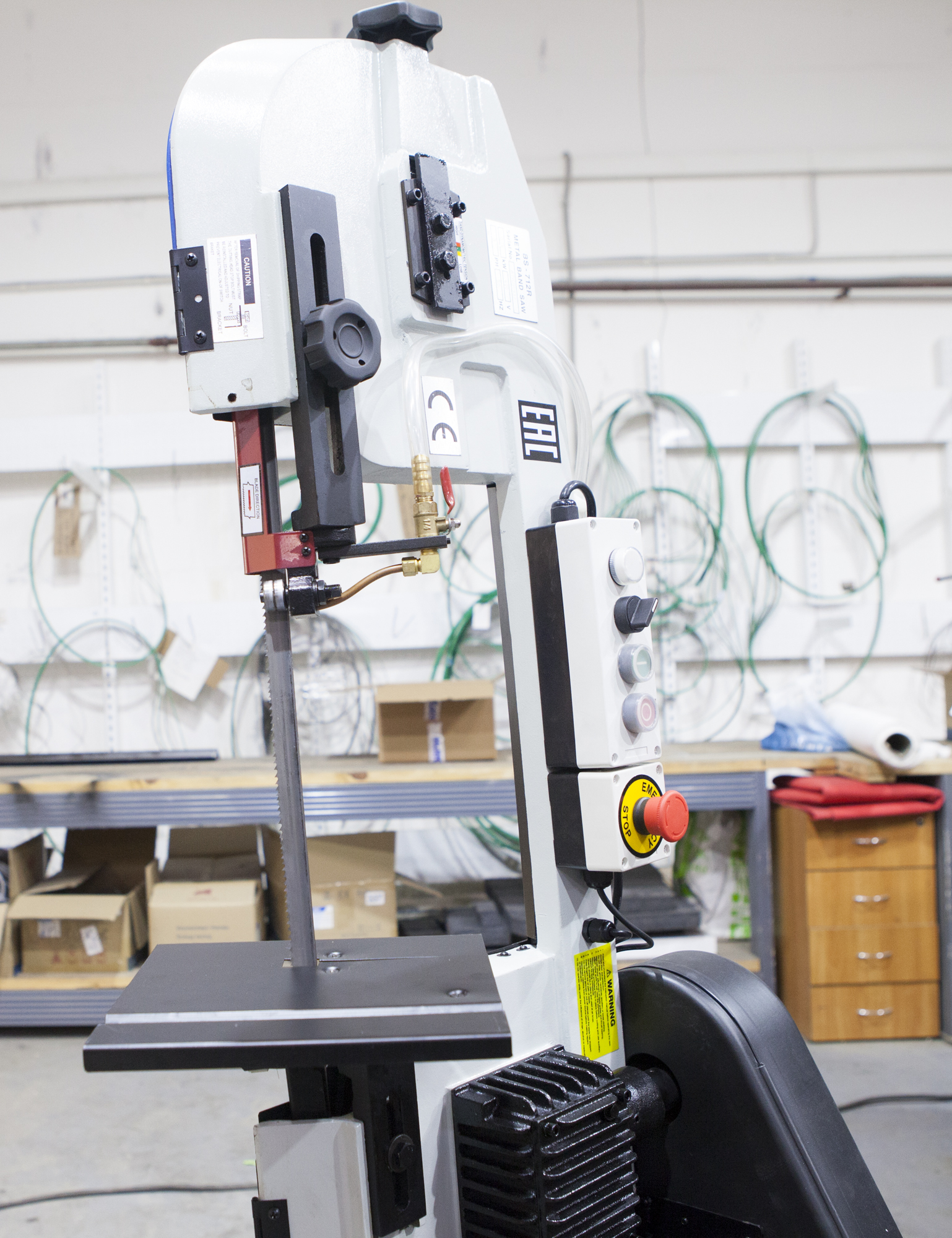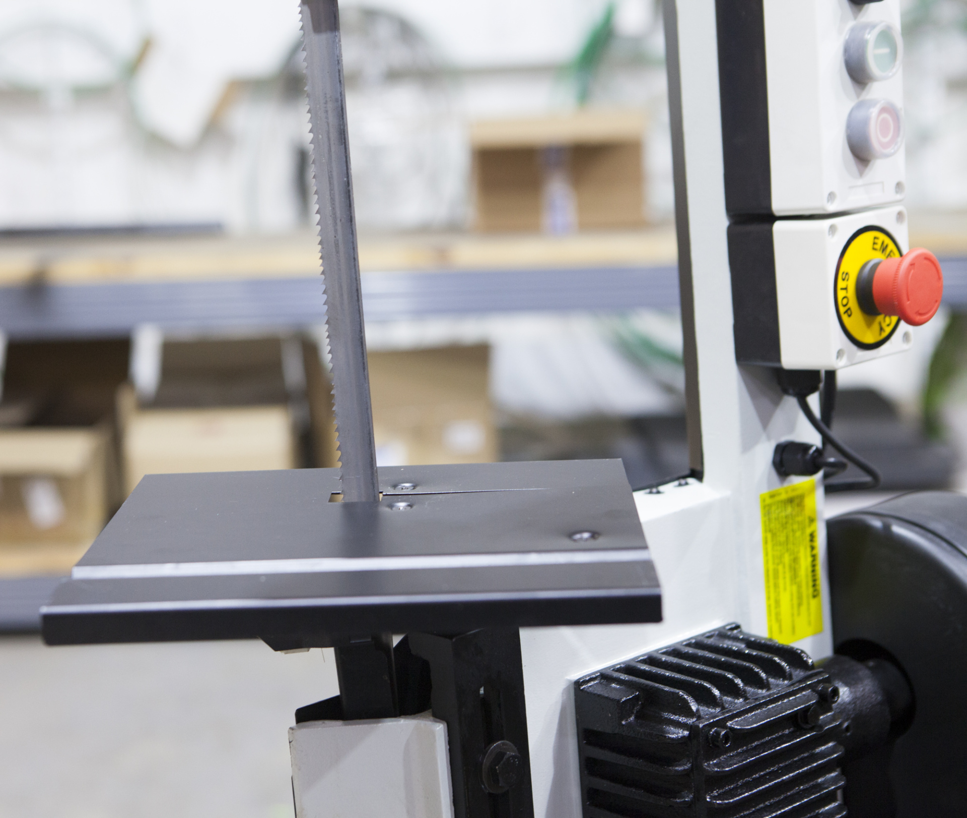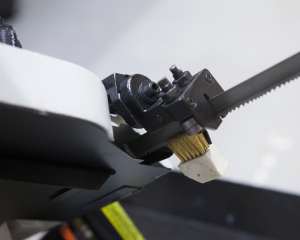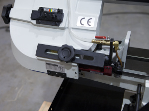 Пильную раму возможно установить в вертикальном положении - для резки небольших изделий из дерева, пластмассы и других заготовок из мягких материалов (для которых не требуется фиксация в тисках во время пиления), при этом станок обязательно должен крепиться к полу. В стандартной комплектации имеется небольшой стол для ручной подачи заготовок, который крепится к раме в вертикальном положении. |