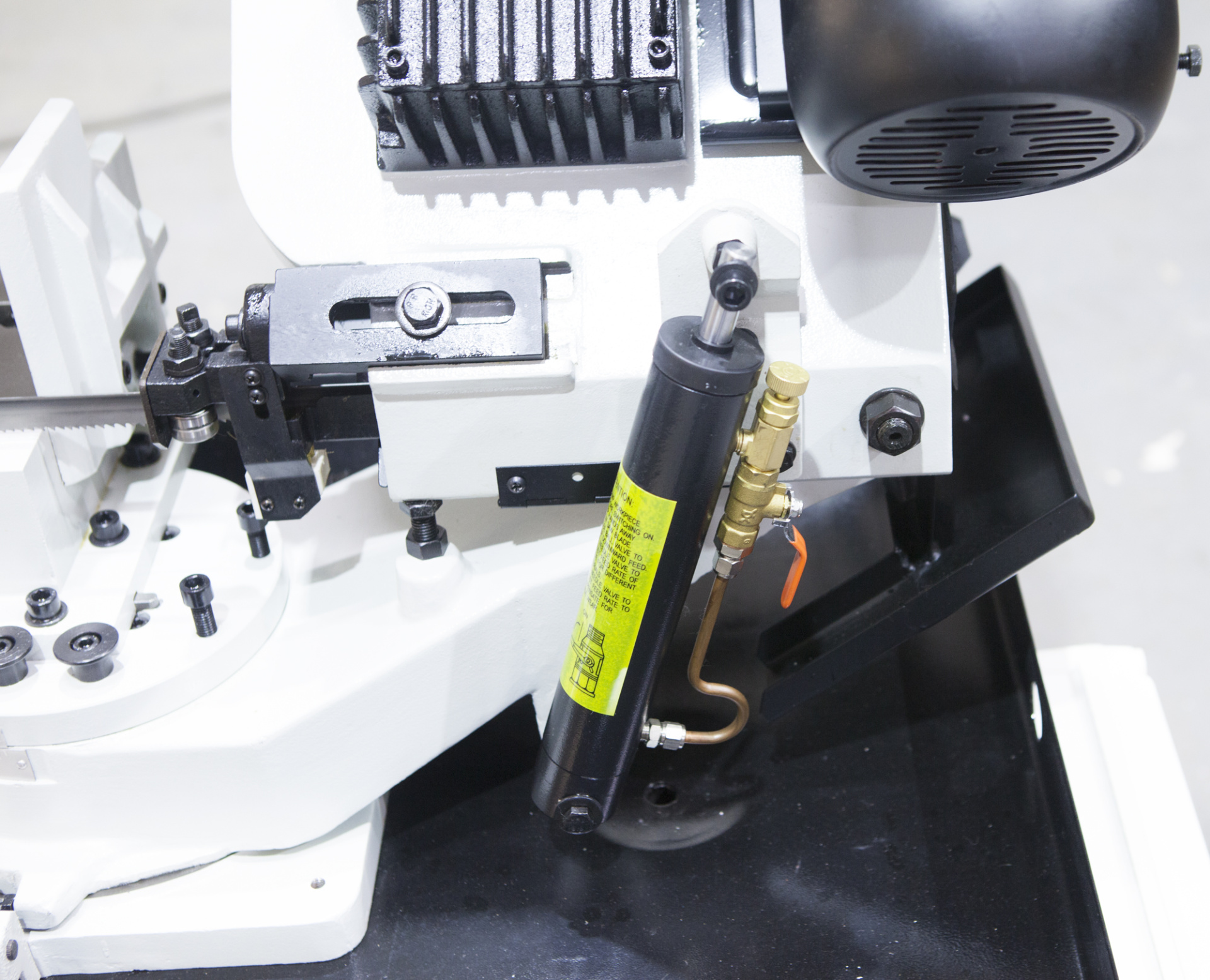 На станках с гидроразгрузкой управление и процесс резки (запуск пилы – опускание рамы – остановка пилы) происходит за счёт запуска двигателя и регулировки гидроцилиндра. Гидроцилиндр имеет переключатель вкл./выкл. гидравлической системы и плавную регулировку опускания рамы верхним маховиком на дроссельном клапане. |