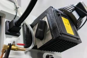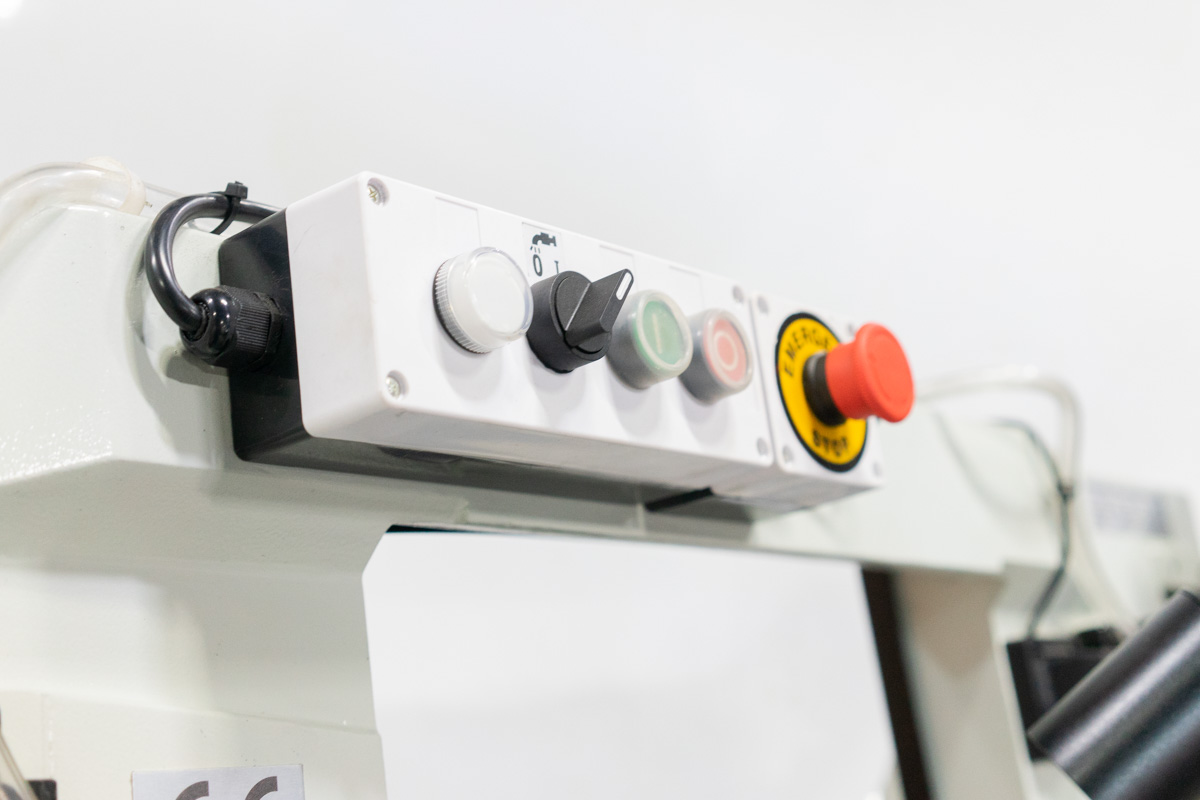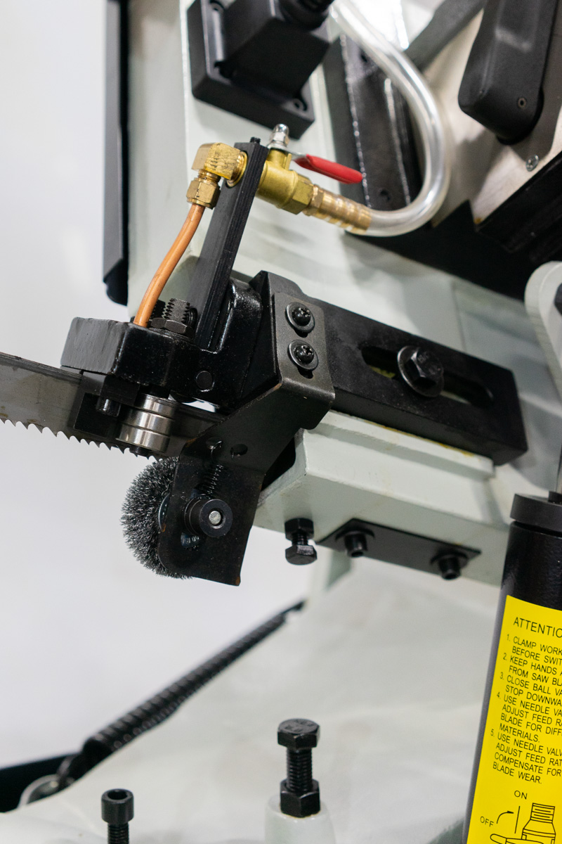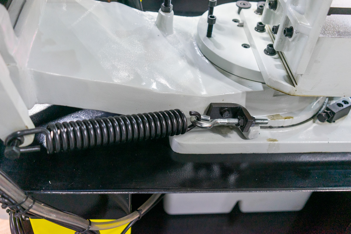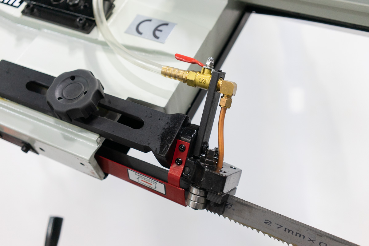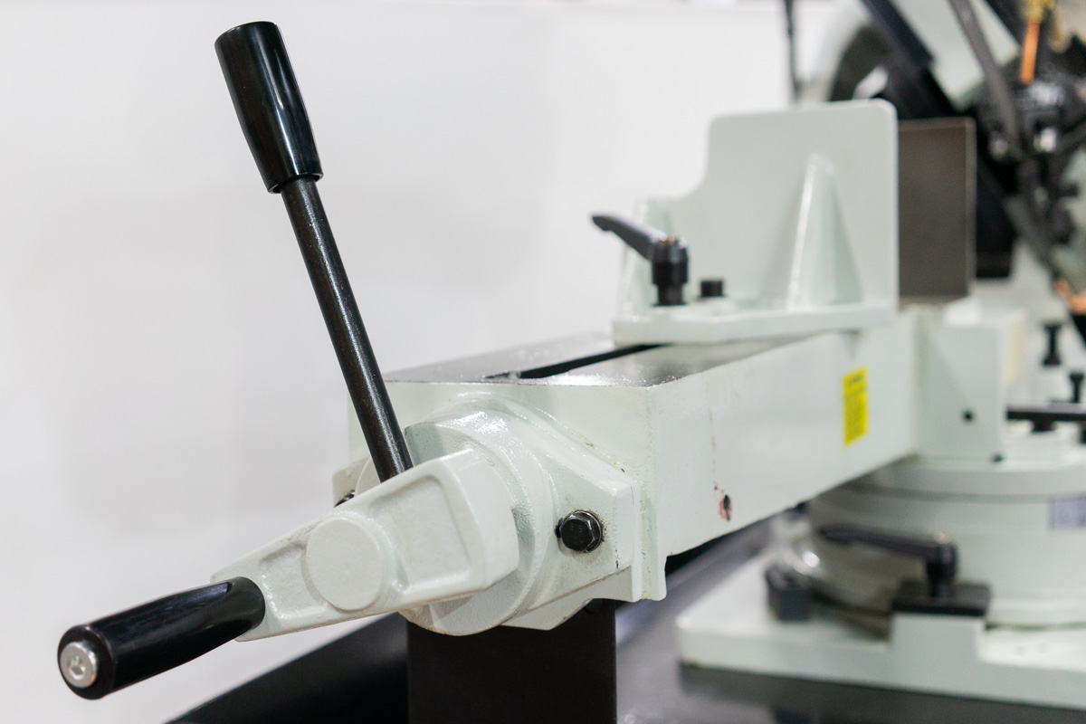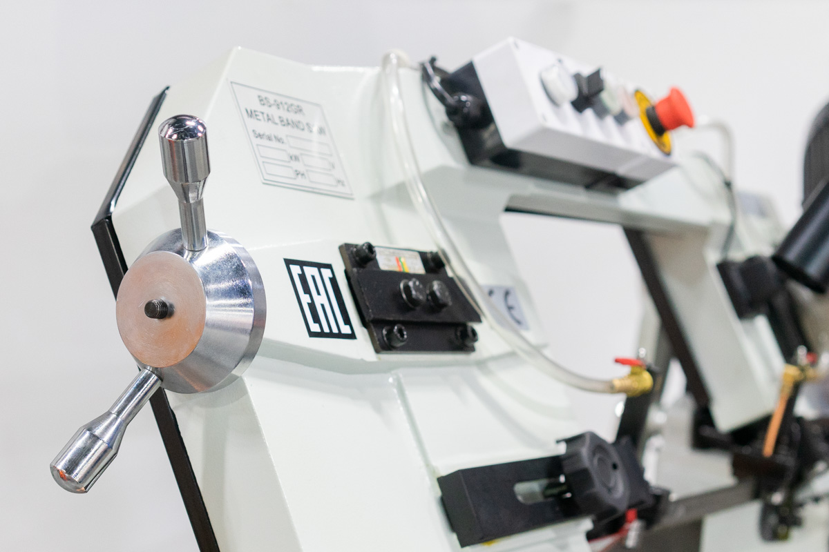 Станок Stalex BS-912GR имеет поворот рамы пилы, тиски при этом остаются в неподвижном состоянии, привод зубчатый. Зажим заготовки осуществляется тисками вручную, подача заготовки - также вручную. Мобильность станков позволяет использовать их на производстве непосредственно там, где это необходимо. Станки находят широкое применение в серийном и мелкосерийном производстве. Система СОЖ с двумя форсунками для подачи в стандартной комплектации.