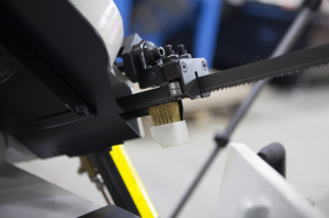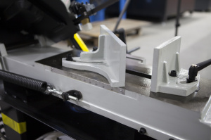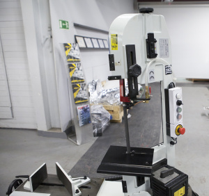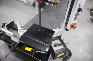 Пильную раму возможно установить в вертикальном положении - для резки небольших изделий из дерева, пластмассы и других заготовок из мягких материалов (для которых не требуется фиксация в тисках во время пиления), при этом станок обязательно должен крепиться к полу. В стандартной комплектации имеется небольшой стол для ручной подачи заготовок, который крепится к раме в вертикальном положении. |
