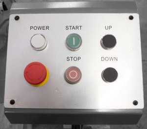 Переносная панель станка имеет кнопки: - кнопка аварийной остановки - датчик работы станка - кнопки включения и выключения - кнопки перемещения верхнего вала вниз и вверх |