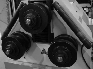 Усиленная конструкция для длительного срока службы, с 2-мя приводными роликами + гидравлический привод верхнего вала. Изменена конструкция в 2022г. с трёх приводных роликов на два приводных нижних ролика – для улучшенного проката большого диаметра труб. При прокате большого диаметра трубы, если все три ролика работают вместе, при вращении его по кругу скорость внутреннего и внешнего кругов различна, это приведет к повреждению поверхности при прокатке круглой трубы.