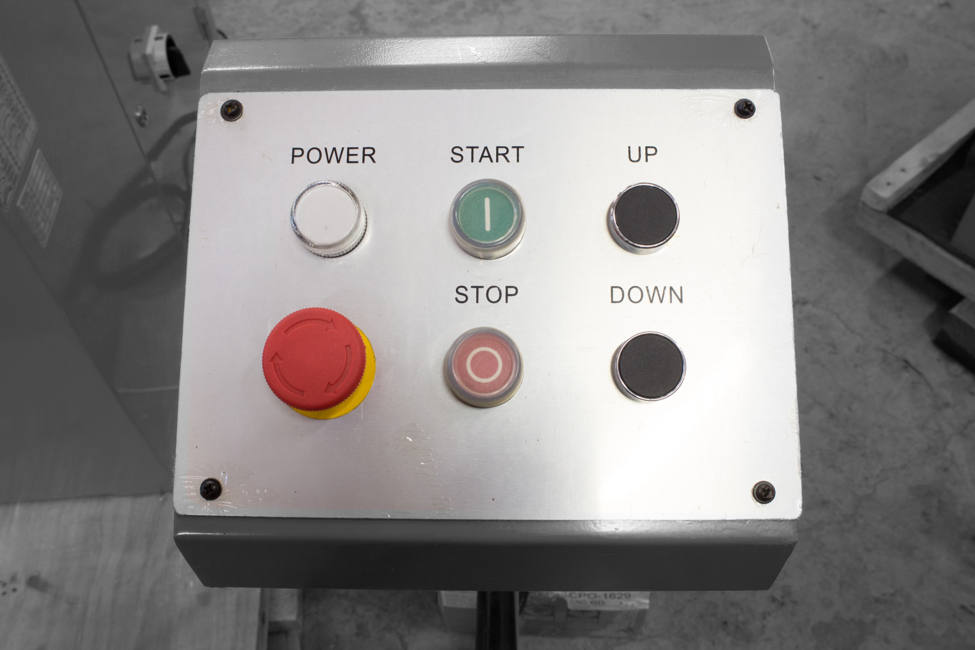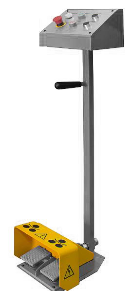 Стойка управления с двумя ножными педалями и кнопкой аварийной остановки снабжена удобной ручкой для переноски.