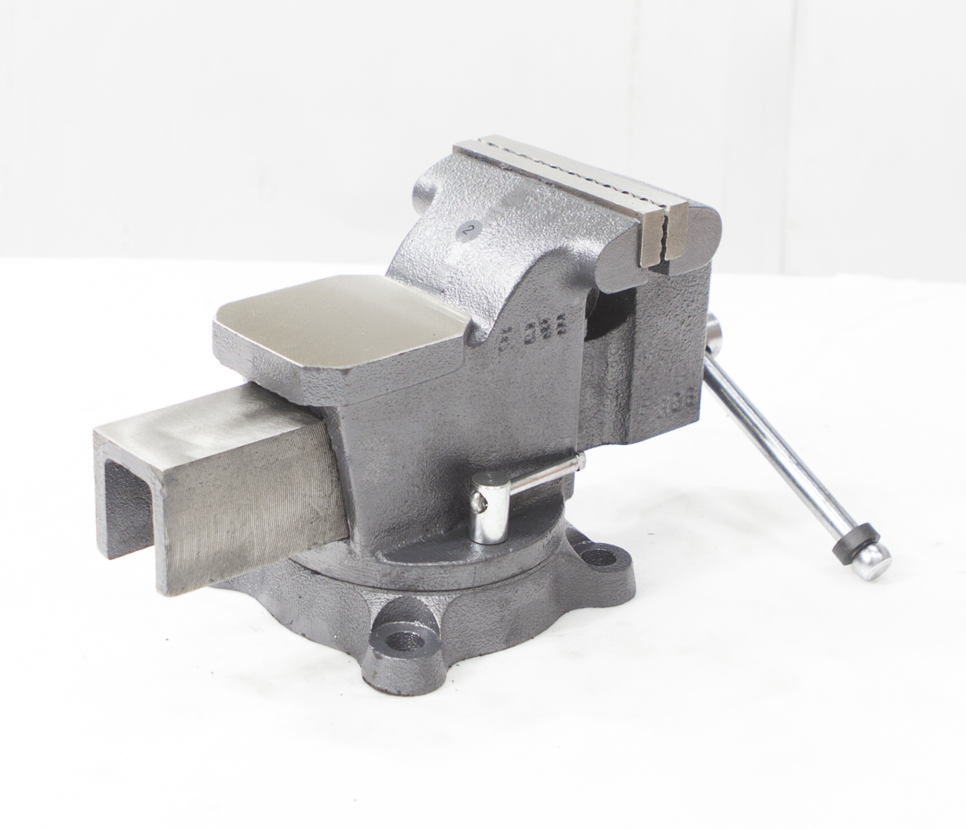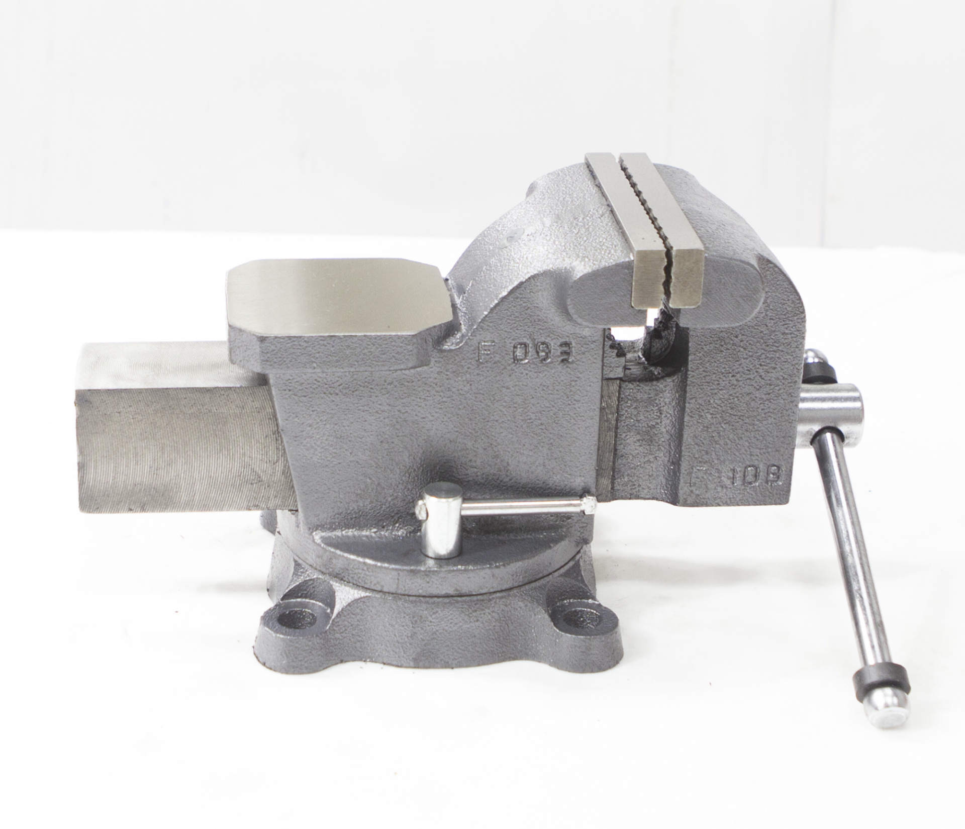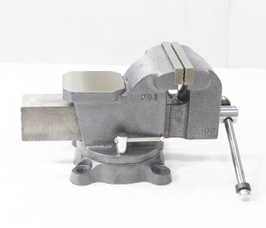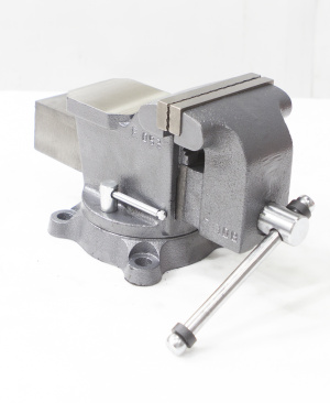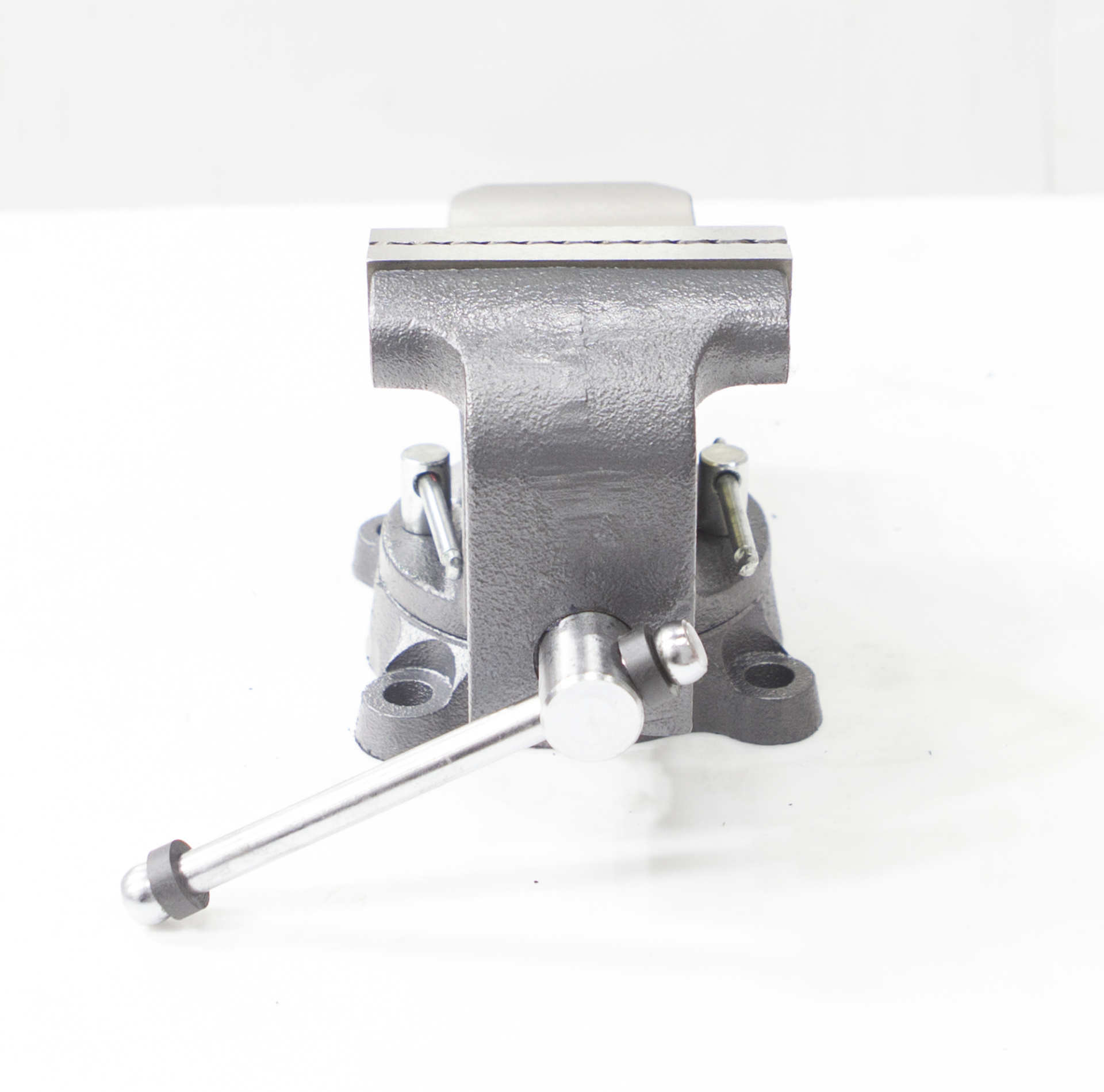 Закрытый ходовой винт тисков защищен от попадания металлической стружки и опилок. Тиски имеют возможность поворота на 360° относительно своего основания.