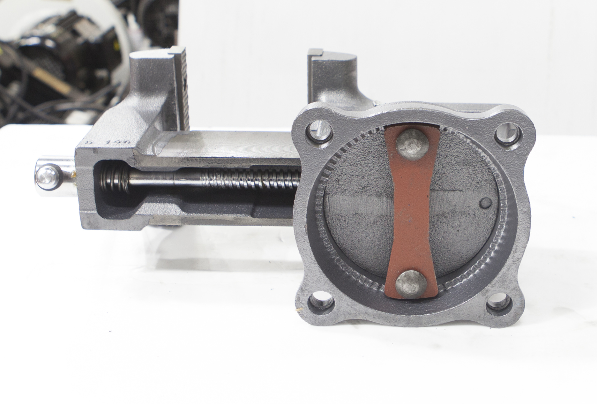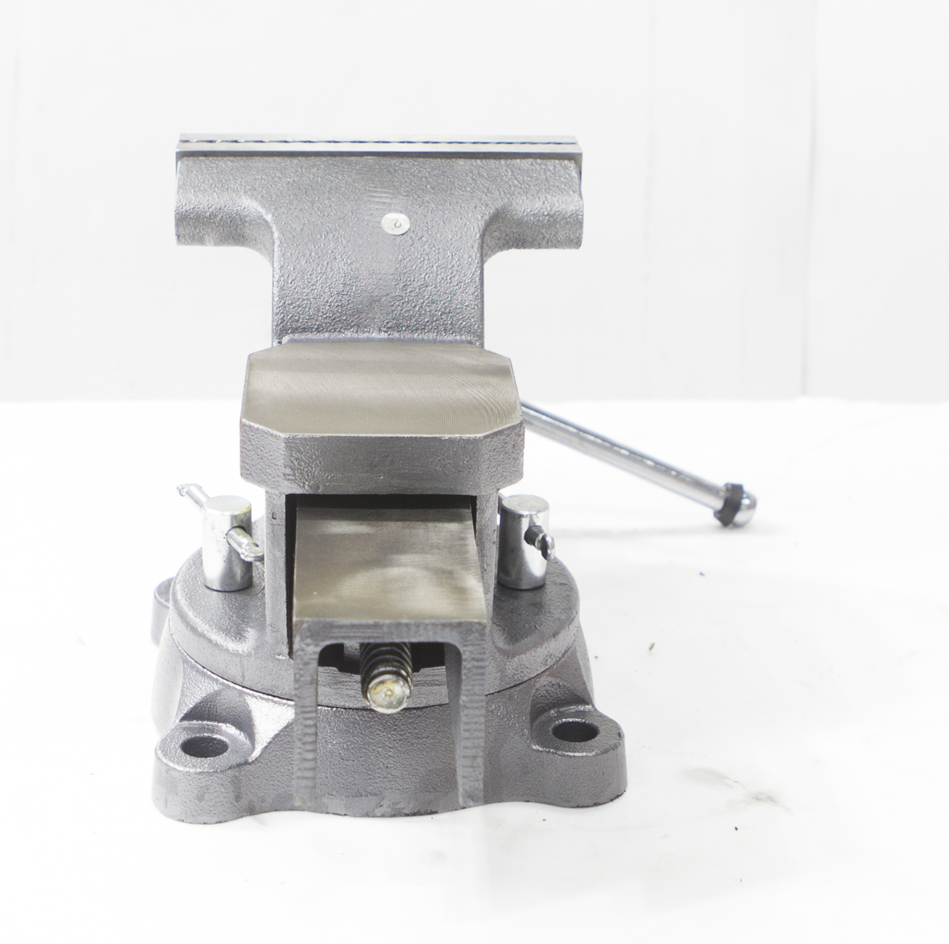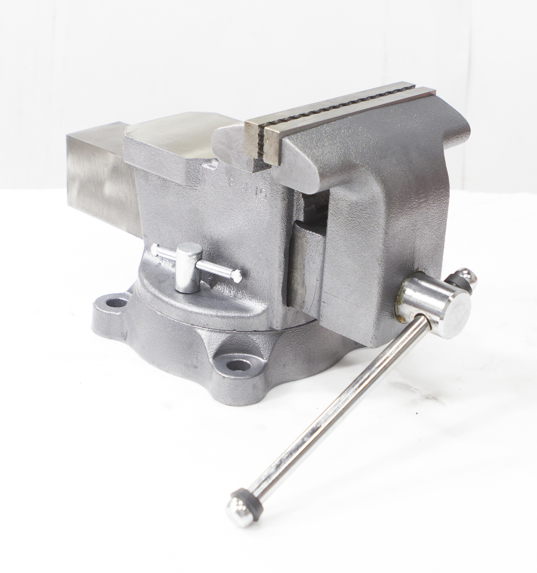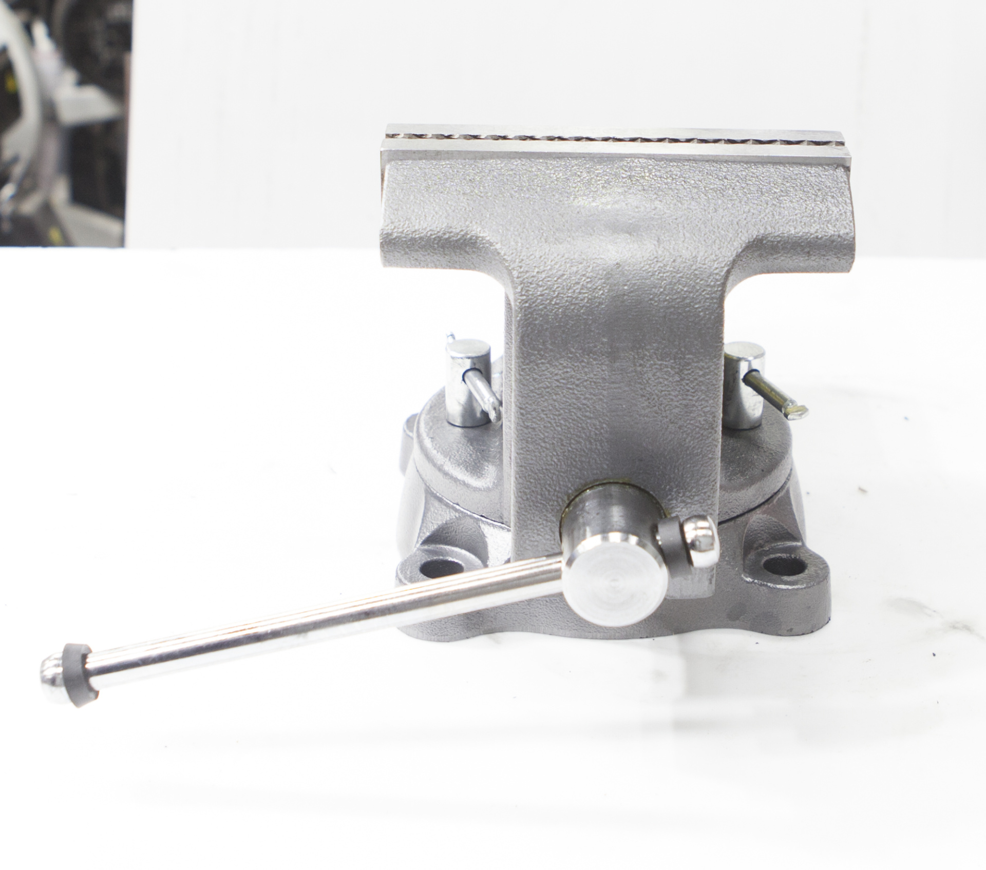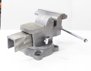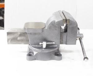 Закрытый ходовой винт тисков защищен от попадания металлической стружки и опилок. Тиски имеют возможность поворота на 360° относительно своего основания.